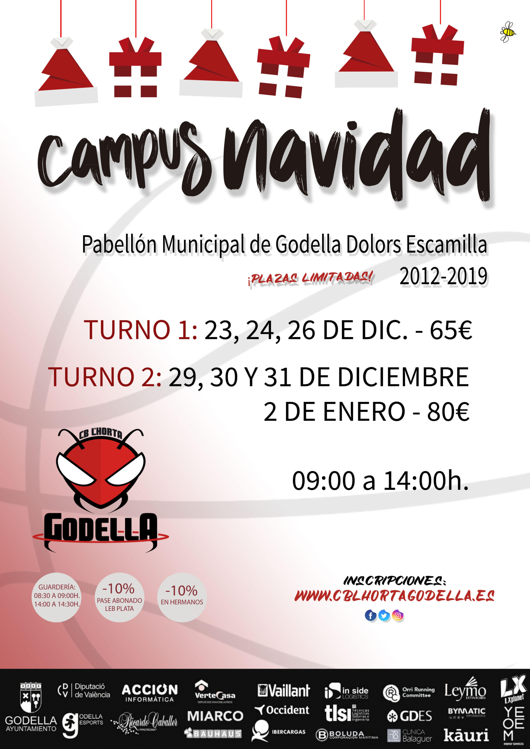 Debemos adjuntar el justificante de ingreso en la cuenta ES98 2100 5859 1702 0006 4156 (concepto campus Navidades 24/25 + nombre niño(s)/a(s)) a nombre de CB L’Horta Godella. El precio del campus por turno completo es de 65€ . Tienes opción a 1 día suelto por 30€. Consulta descuentos en el cartel.